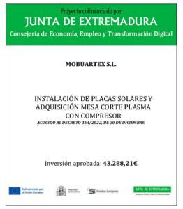 «El objeto del Proyecto era Instalar Placas Solares y adquirir una mesa de corte de plasma con compresor que ha permitido ahorrar considerablemente los costes de electricidad y agilizar los cortes de chapones metálicos con el fin de hacer crecer la empresa, habiendo obtenido una ayuda de 25.972,93 euros cofinanciados por el Fondo Europeo de Desarrollo Regional (FEDER)».